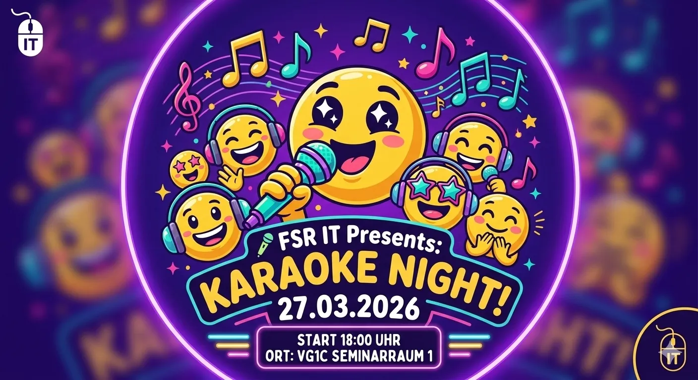 Wir laden euch herzlich zu unserem Karaoke-Abend im VG1C Seminarraum 1 ein. Ab 18:00 Uhr öffnen wir die Bühne für alle, die Lust auf gute Laune, Musik und eine tolle Gemeinschaft haben. Es spielt keine Rolle, ob ihr jeden Ton trefft oder einfach nur Spaß haben wollt – bei uns ist jede Stimme willkommen! 🌟